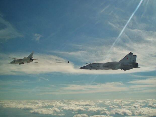 📷❗️Редкий кадр дозаправки российского истребителя-перехватчика МиГ-31БМ посредством системы "шланг-конус" от фронтового бомбардировщика Су-24М.
